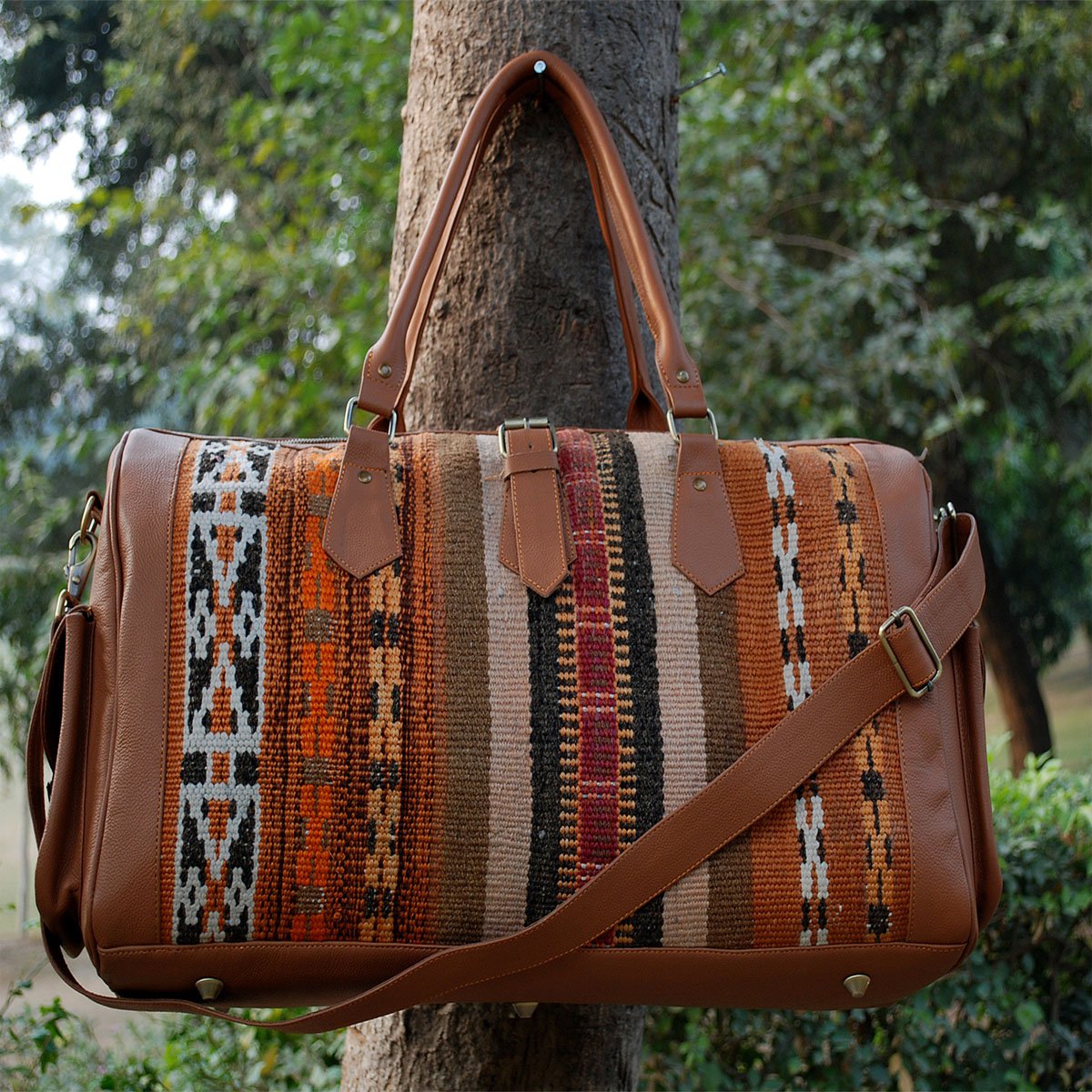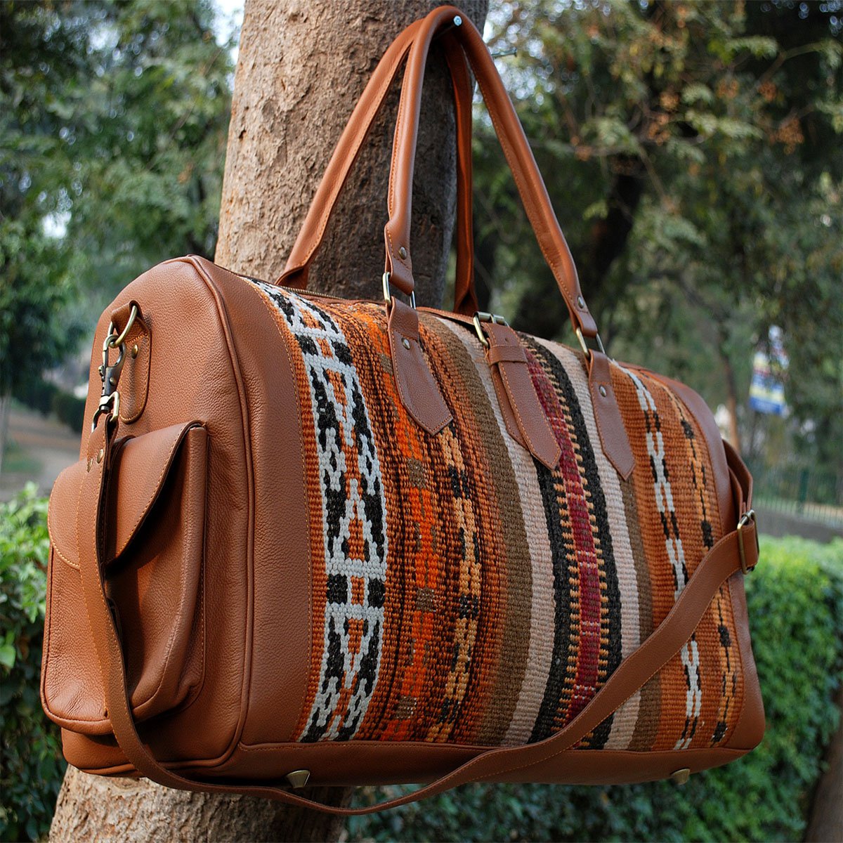 Handgemaakte, ruime Kelim lederen reistas van FYBERNOTS met uniek patroon. Elke tas heeft een exclusief ontwerp, geproduceerd door deskundige ambachtslieden. De tassen zijn gemaakt van 100% echt leder en wollen kelim. Elke tas heeft een binnenvak met ritssluiting en is groot genoeg om al je spullen in op te bergen. Dubbele riemen, versterkte bodem, interne ritssluiting en afneembare schouderbanden maken deze tas functioneel en toch een echte eye-catcher.