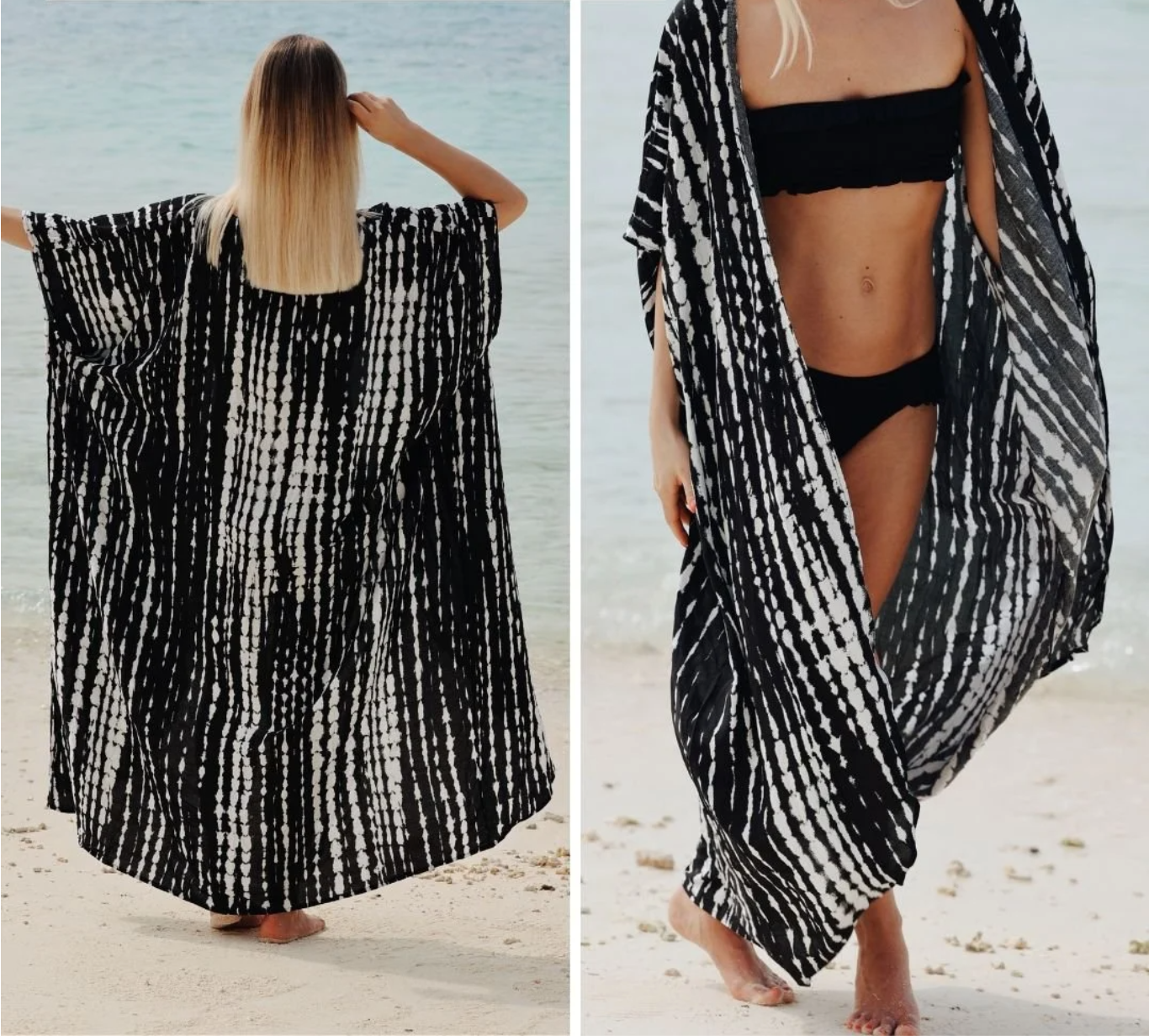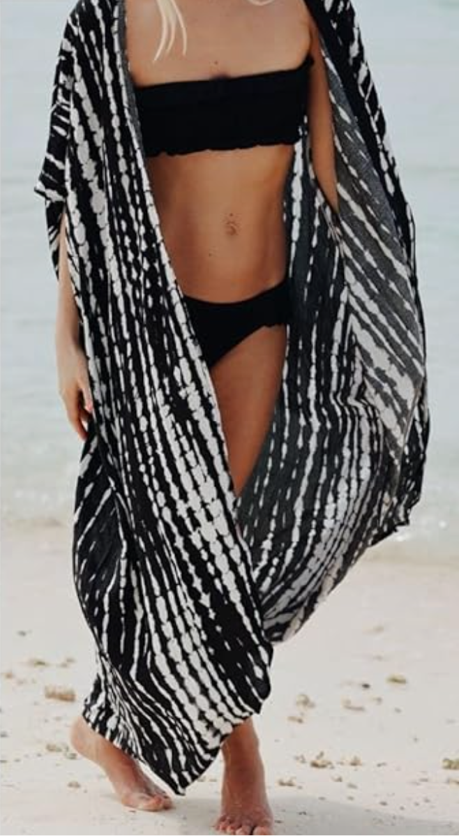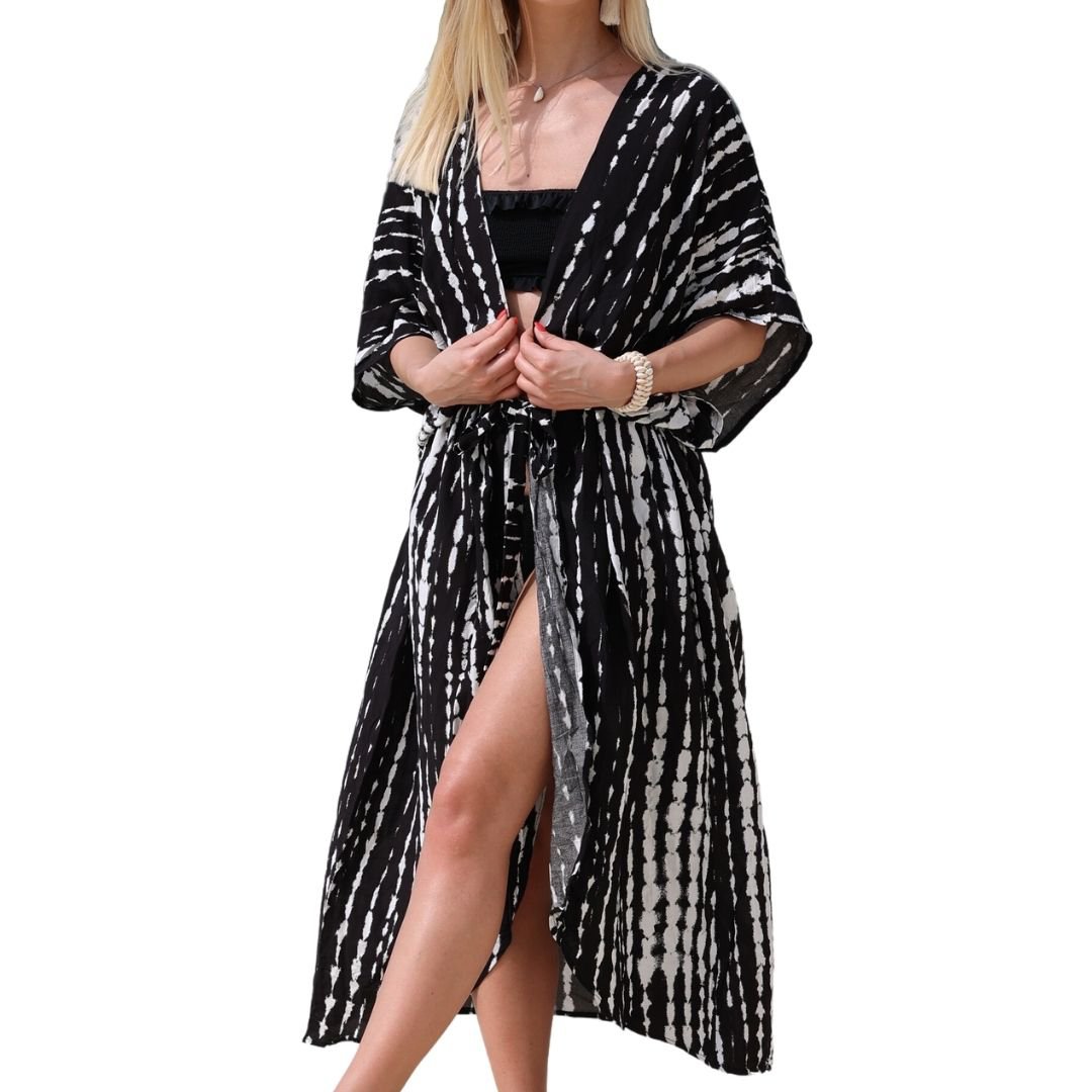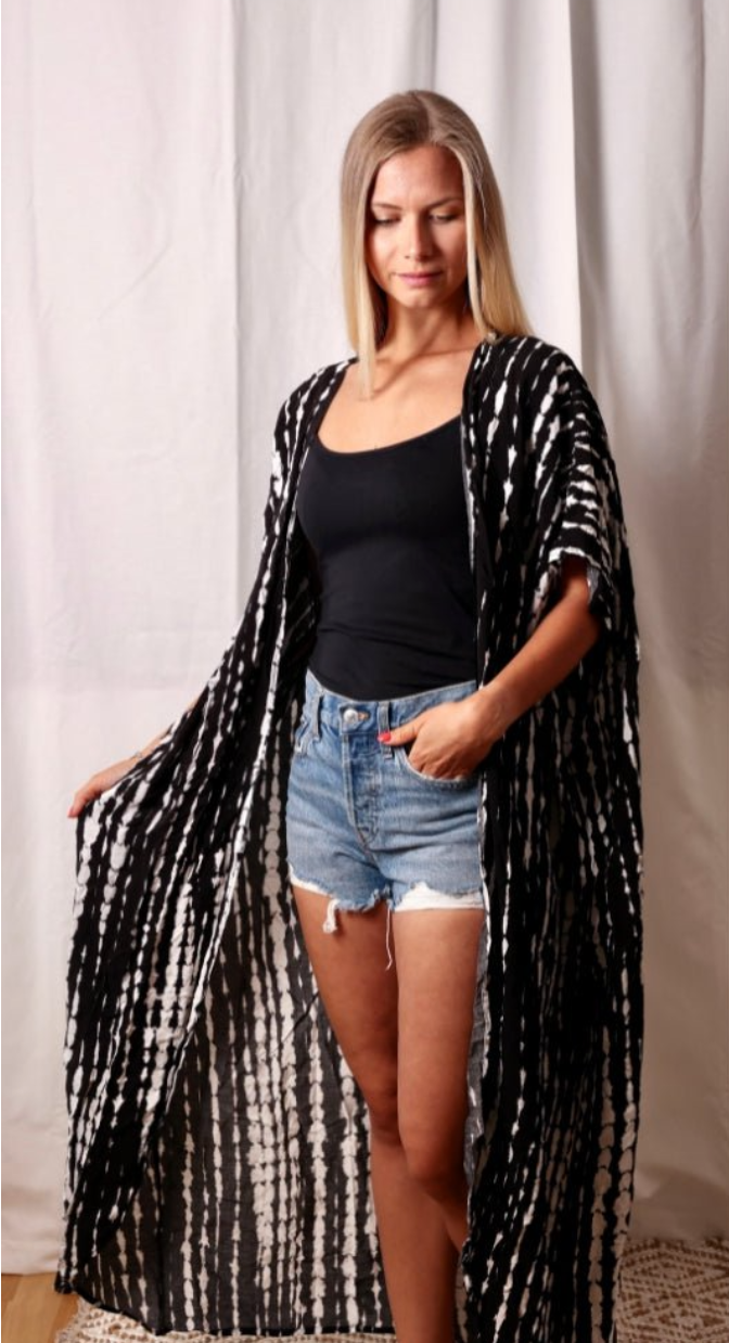 Een prachtige print, luchtig en los: deze zwart-witte kimono met tie-dye print is perfect voor je bohemian look! Of je hem nu open draagt op het strand, of gebruikt om je outfit te pimpen, hij zit perfect en is geschikt voor elke maat.