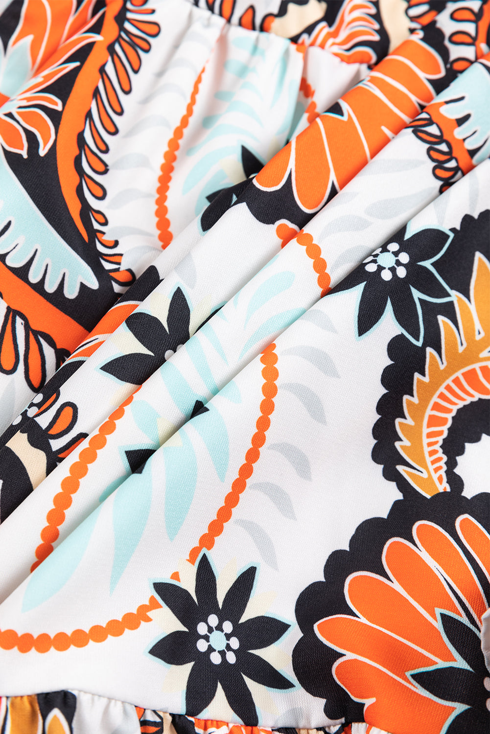 Korte jurk met bekende "Paisley" print in oranje tinten. De strakke schouderlijn en de lange mouwen met ruches zorgen voor een elegant geheel.