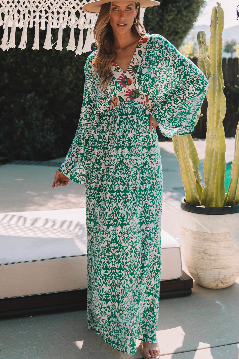 Deze maxi Jurk is niet alleen supercomfortabel, ze valt ook heel elegant dankzij de vlindermouwen. De emeraldgroene print wordt afgewisseld door een kleurrijke v-hals die doorloopt via de tailleband en op de onderrug gestrikt kan worden. Interessant voor de grotere dames: deze jurk is ook écht lang genoeg ;)