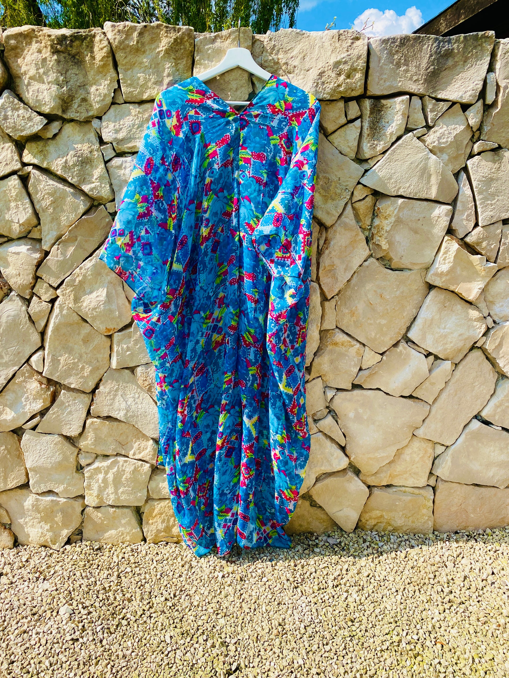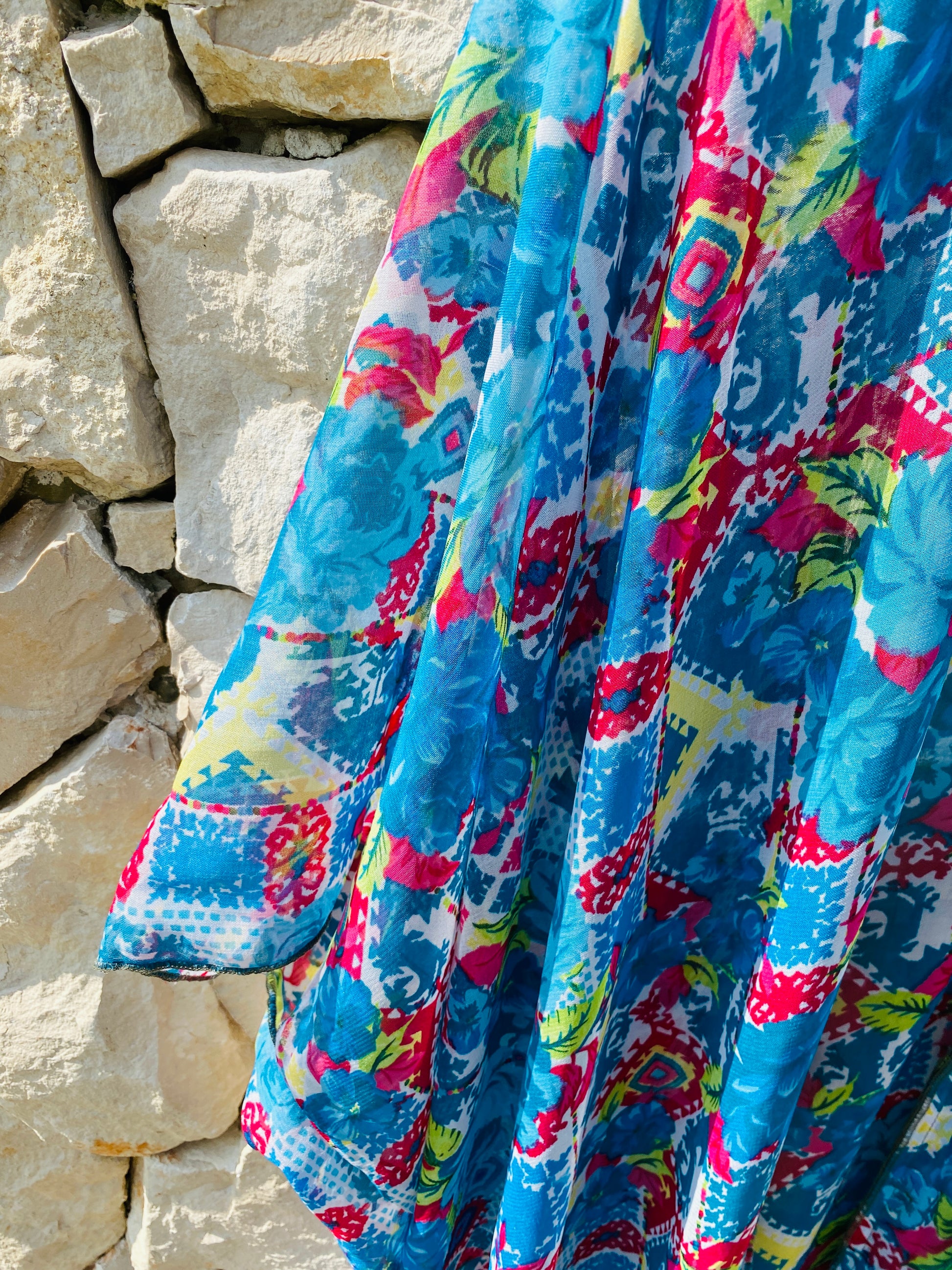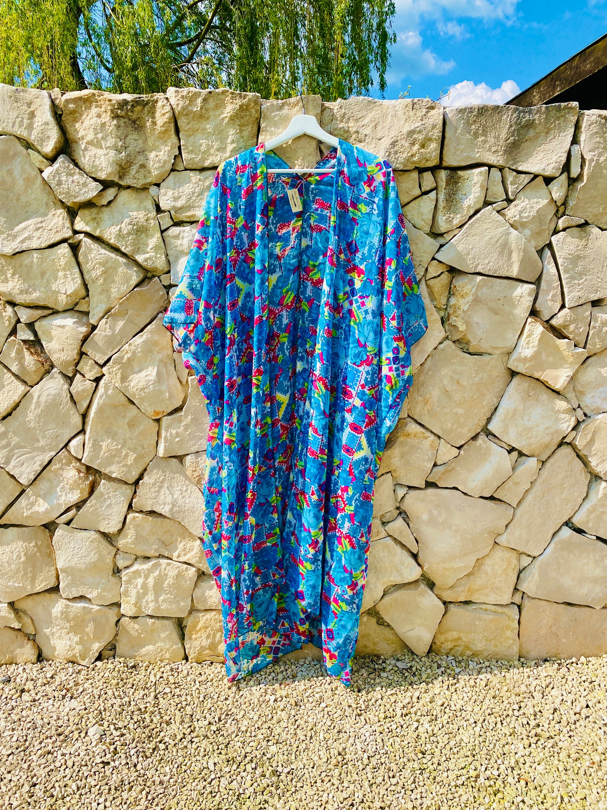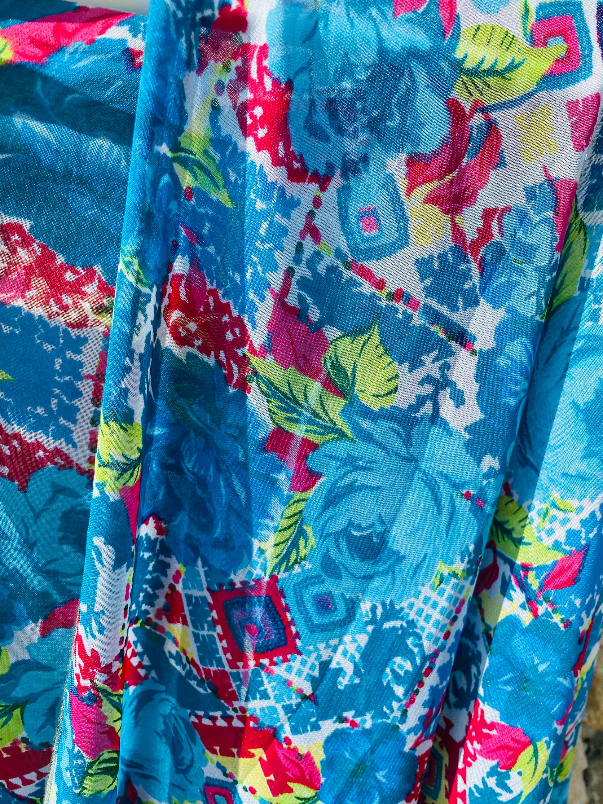 Deze lichtgewoven chiffon kimono valt heel luchtig en is perfect om te dragen boven een bikini. Hij heeft halflange mouwen, een kleurrijke turquoise print en is semi-transparant. Ik vond hem in een boetiekje in het pittoreske Santa Gertrudis.