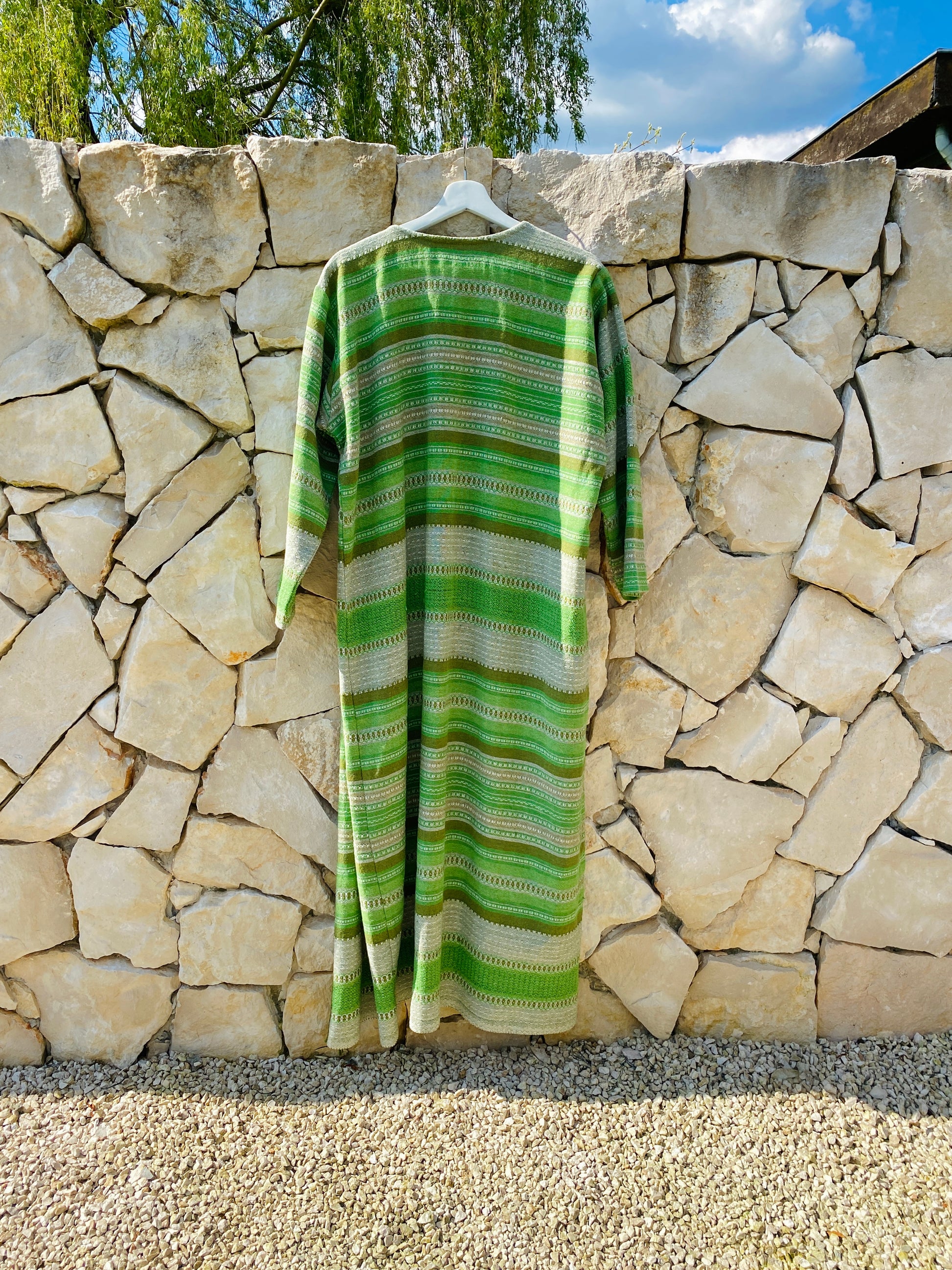 Deze gewoven kimono kocht ik van een local op een vintage-marktje in Ibiza en is dus echt een uniek, one of a kind piece! Hij heeft lange mouwen, een ronde hals en een met kwastjes afgewerkte bies. Door de iets dikkere stof is deze perfect voor het tussenseizoen of de wat chillere zomeravonden.