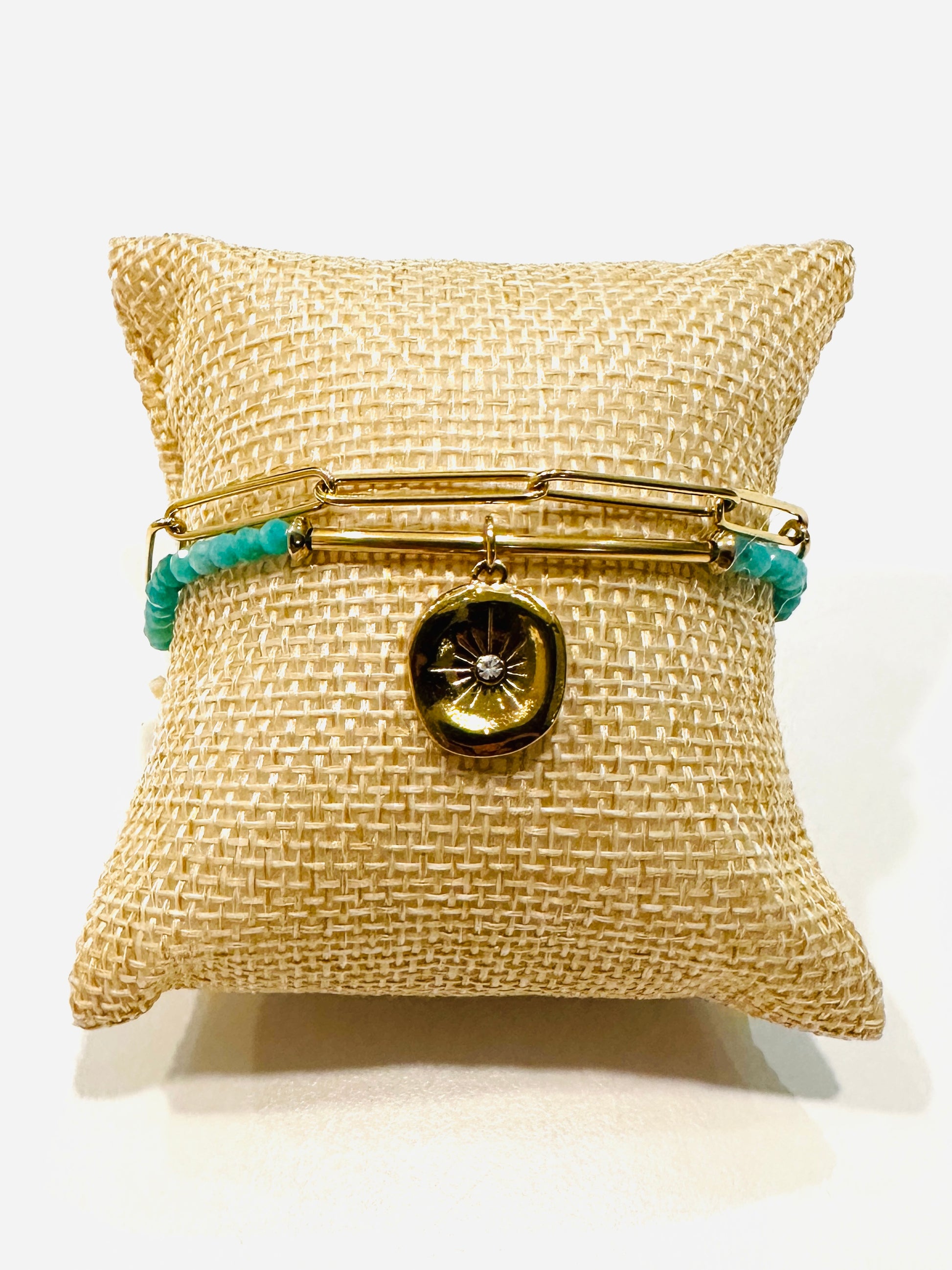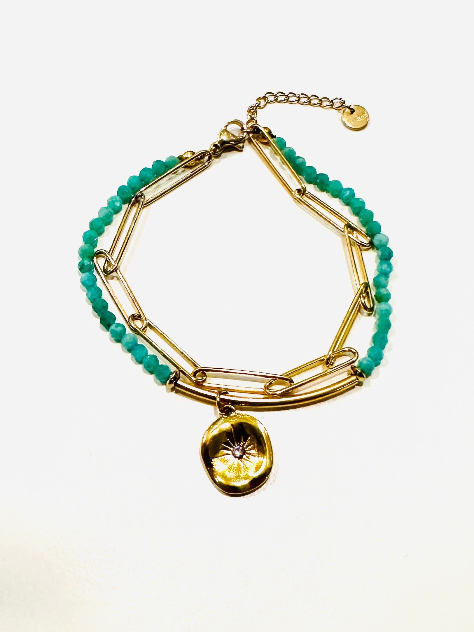 Deze prachtige dubbele armband is gemaakt uit roestvrij staal, verguld met 18K goud en bevat een gouden bedeltje met strass.