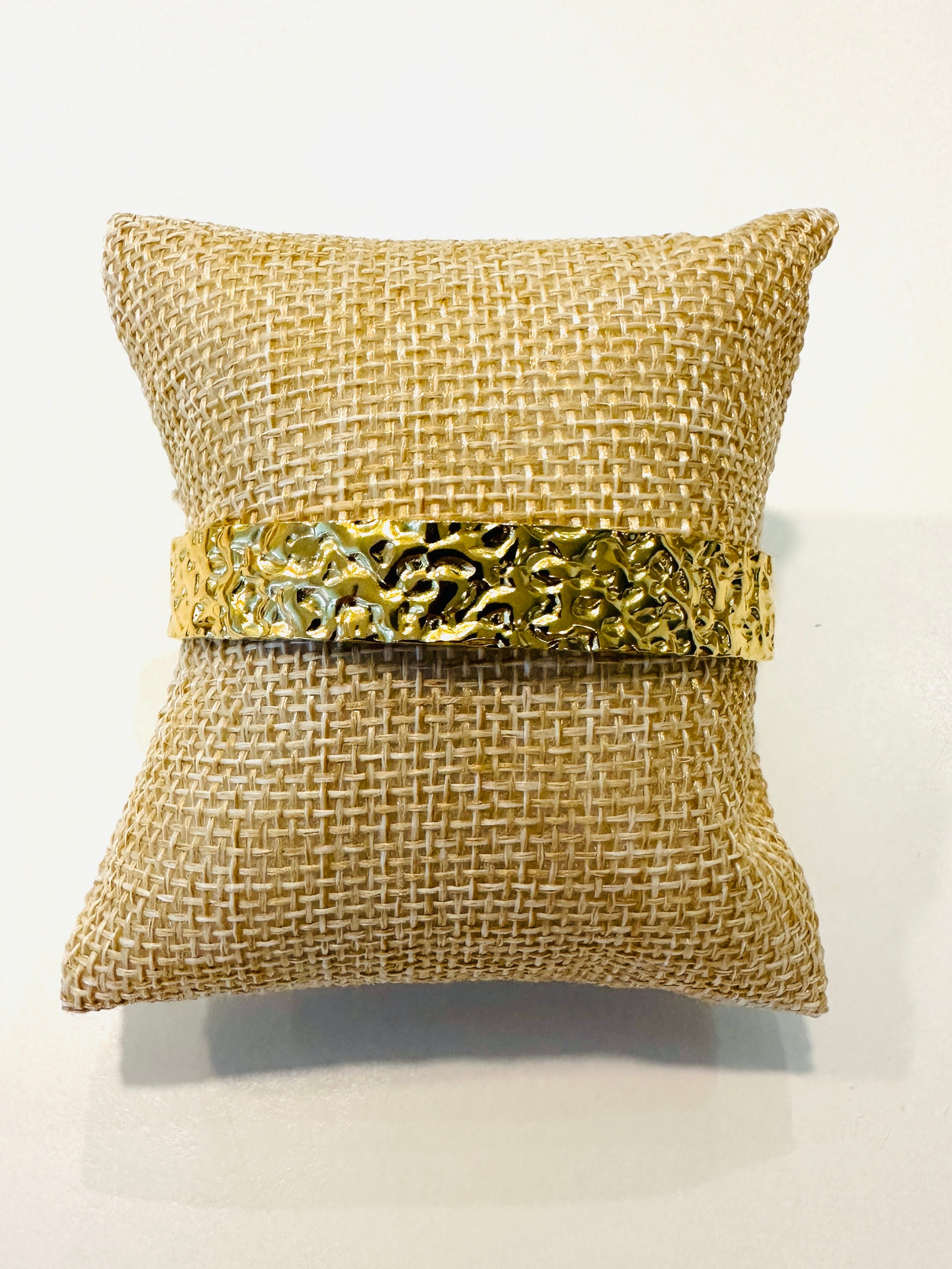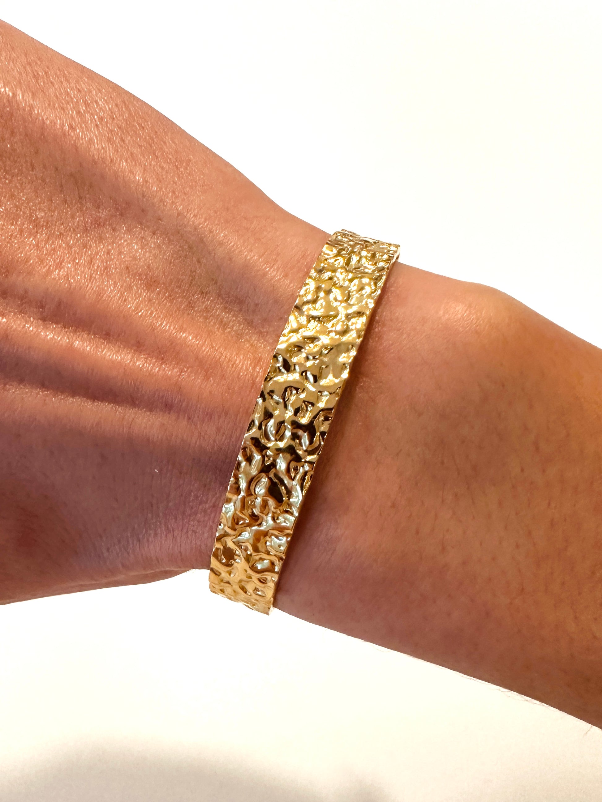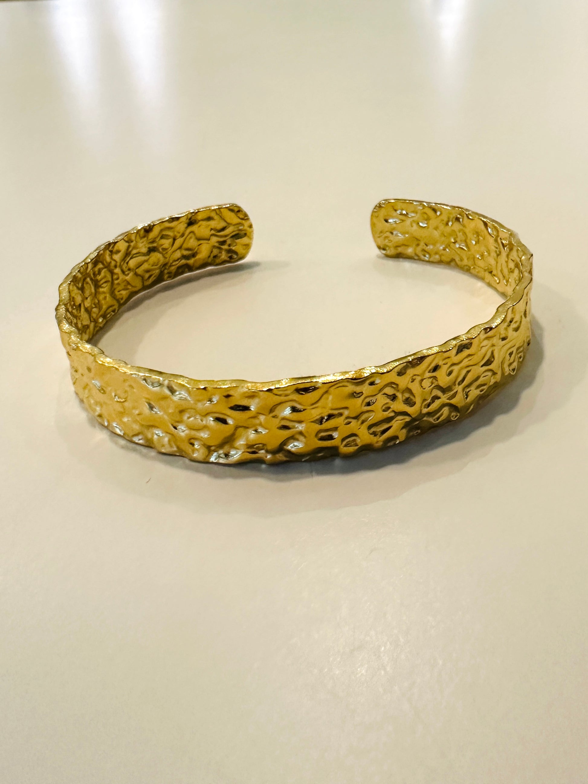 Deze prachtige titanium armband is verguld met 18K goud en kan je lichtjes buigen zodat hij om bijna elke pols past.