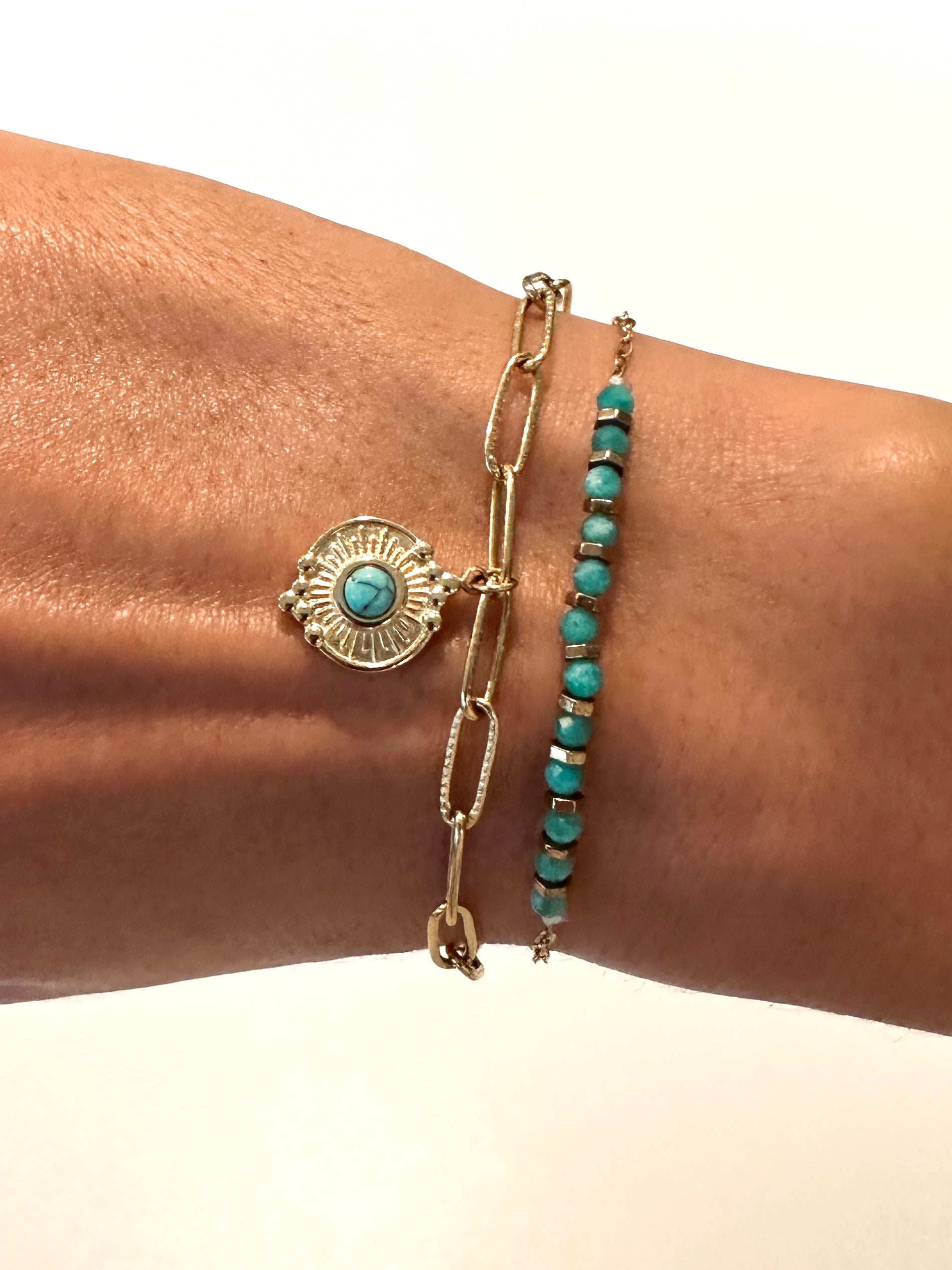 Hij is gemaakt uit roestvrij staal, verguld met 18K goud en bevat een gouden bedeltje met turquoise natuursteen.